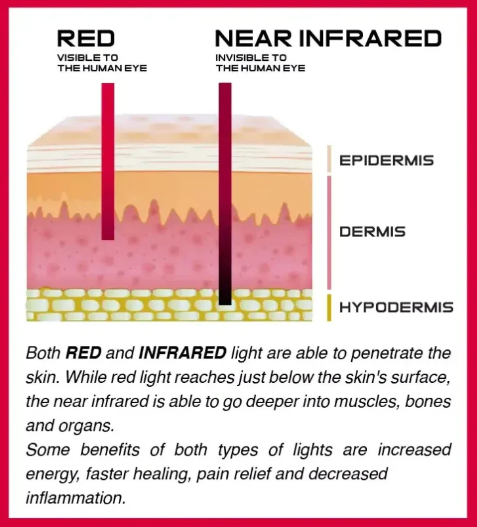 Red light therapy works by delivering red (620-660nm) and near-infrared (810-850nm) light through the skin, which is absorbed by the mitochondria in cells. This boost in cellular energy enhances cellular repair, regeneration, and overall function.